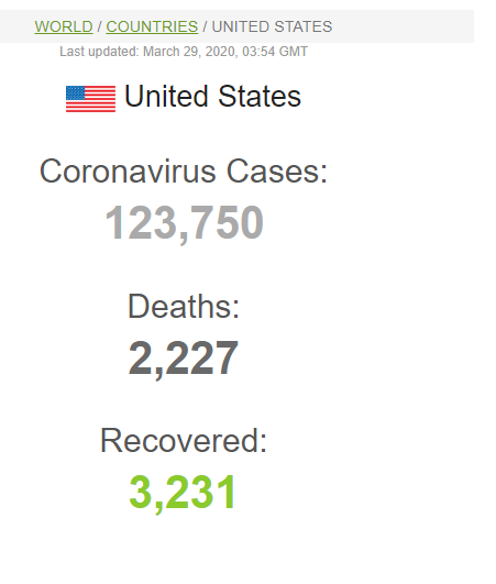 Những bình luận trên được đưa ra trong bối cảnh số ca mắc và qua đời vì Covid-19 ở Mỹ tăng mạnh. Theo số liệu trên trang web Worldometer, trong ngày 28/3, Mỹ ghi nhận thêm hơn 16.400 ca mắc Covid-19, nâng tổng số người nhiễm bệnh tại nước này lên 120.529 ca. Với 312 ca qua đời trong ngày, hiện tổng số người chết vì Covid-19 tại Mỹ đã lên 2.008 trường hợp. Trong khi đứng đầu thế giới về số ca mắc Covid-19, Mỹ cũng đứng thứ 7 thế giới về số người chết do dịch bệnh này.