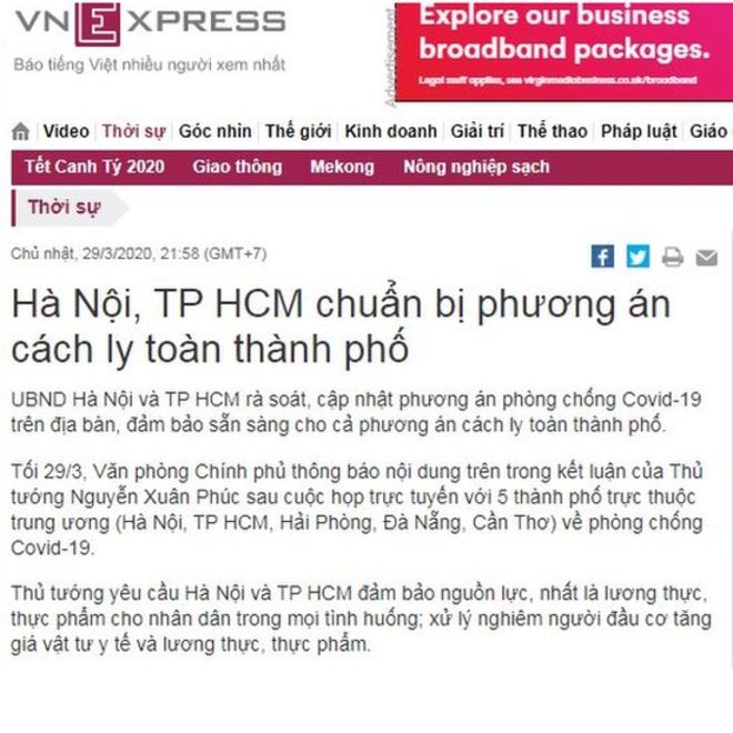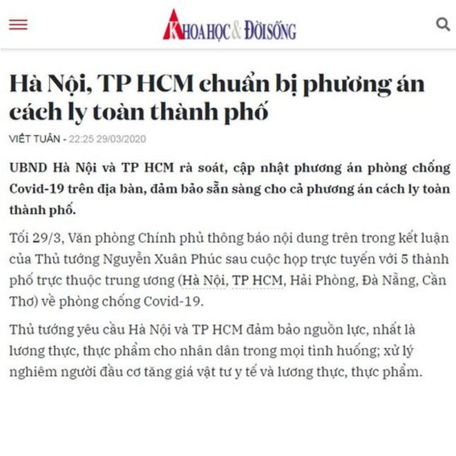 Bộ trưởng, Chủ nhiệm Văn phòng Chính phủ Mai Tiến Dũng trong cuộc họp báo hôm 28/3 xác nhận rằng tình hình dịch bệnh vẫn đang trong tầm kiểm soát, và tin phong toả một số thành phố lớn, trong đó có Hà Nội và Thành phố Hồ Chí Minh là 'không chính xác'.