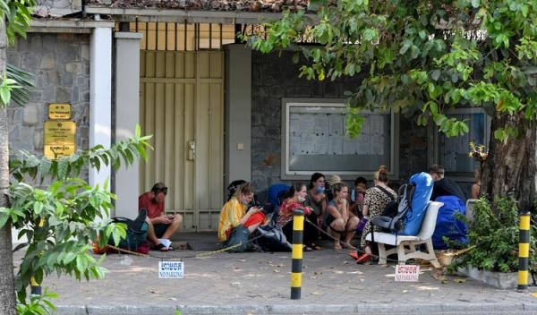 Một nhóm du khách Đức bị mắc kẹt ở Cambodia đang ở bên ngoài Đại sứ quán Đức tại Phnom Penh. Ảnh: Pann Rachana.