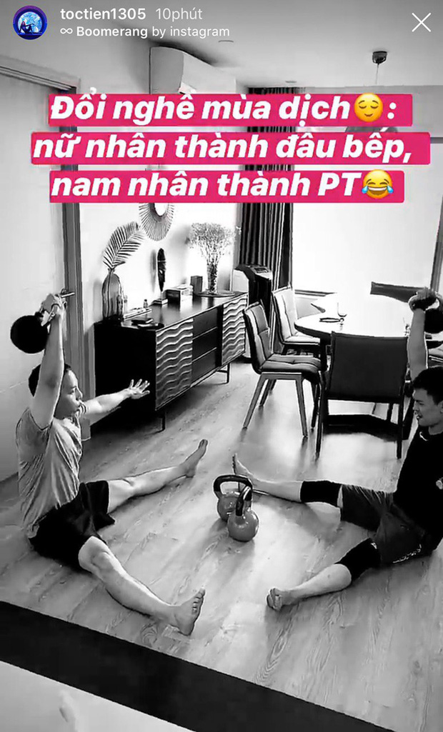 Mới đây, Tóc Tiên tiếp tục cập nhật hoạt động mới nhất của Hoàng Touliver trên Instagram Story. Đây là lần đầu tiên anh xuất hiện trên Story của bà xã. Cụ thể, Tóc Tiên đăng tải khoảnh khắc ông xã chăm chỉ tập thể dục tại nhà giữa mùa dịch Covid-19 để cơ thể khỏe mạnh, tăng cường sức đề kháng. Giọng ca “Ngày tận thế” hài hước: “Đổi nghề mùa dịch: Nữ nhân thành đầu bếp, nam nhân thành PT”.