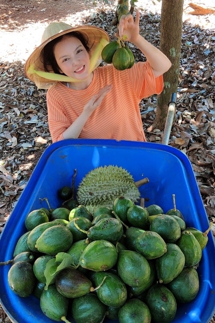 Đang trong thời gian nghỉ tránh dịch. Lý Nhã Kỳ thu hoạch trái cây ở vườn nhà Long Khánh. Bơ và sầu riêng cũng là hai loại quả mà Lý Nhã Kỳ rất thích.