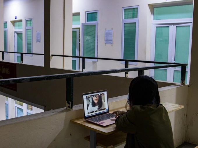 Thu, bạn cùng phòng với Phương Anh, học lớp online qua phần mềm Zoom vào ban đêm ở hành lang khu cách ly. Ảnh: Phương Anh.