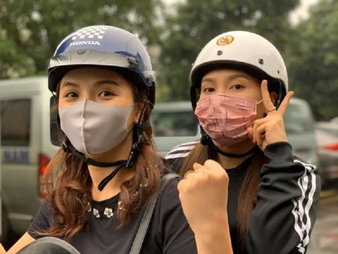 Thu Quỳnh (trái), Bảo Thanh đeo khẩu trang đóng phim. Ảnh: VTV.