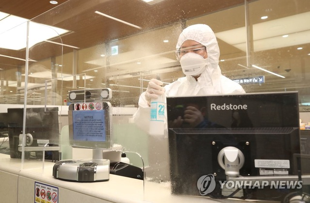 Một nhân viên bộ phận nhập cư tại sân bay Incheon, Hàn Quốc khử trùng khu vực làm việc hôm 8/4 (Ảnh: Yonhap)