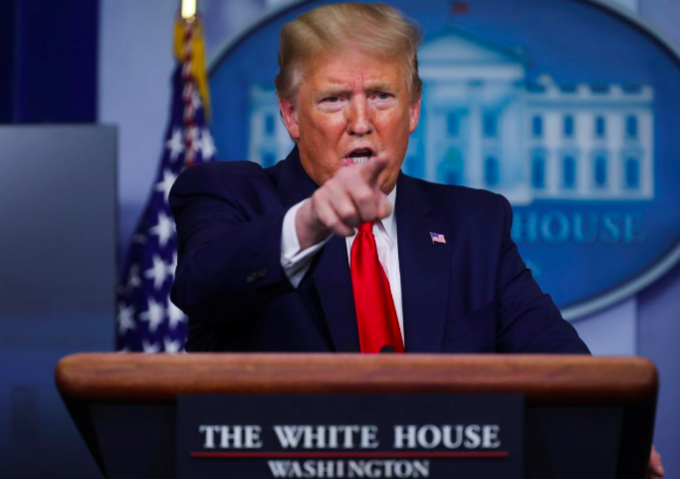 Tổng thống Mỹ Trump chỉ vào một phóng viên trong cuộc họp báo tại Nhà Trắng về Covid-19 hôm 20/4. Ảnh: Reuters