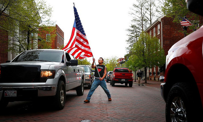 Người biểu tình vẫy quốc kỳ Mỹ trên đường phố Annapolis hôm 19/4. Ảnh: Reuters.