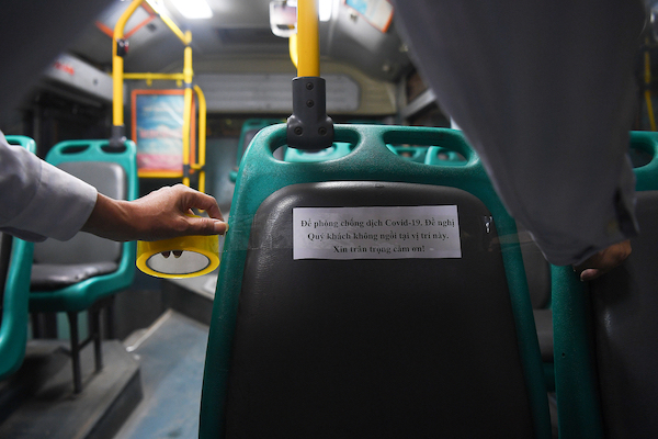 Các ghế xe được dán giấy nhắc hành khách đảm bảo giãn cách xã hội. ​​Theo quy định của Tổng công ty vận tải Hà Nội, mỗi chuyến xe không được chở quá 50% sức chứa và không quá 20 người (18 hành khách và lái, phụ xe).