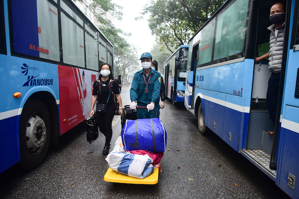 Trong những ngày cách ly xã hội, xe của Xí nghiệp xe buýt Hà Nội được trưng dụng để chở người hết thời hạn cách ly về quê.
