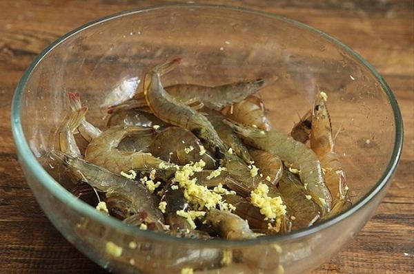 - Bước 1: Tôm cắt bỏ chân, rửa sạch, để ráo nước rồi cho vào bát. Thêm gừng băm nhỏ cùng rượu nấu ăn vào trộn đều. Ướp tôm khoảng 20 phút.
