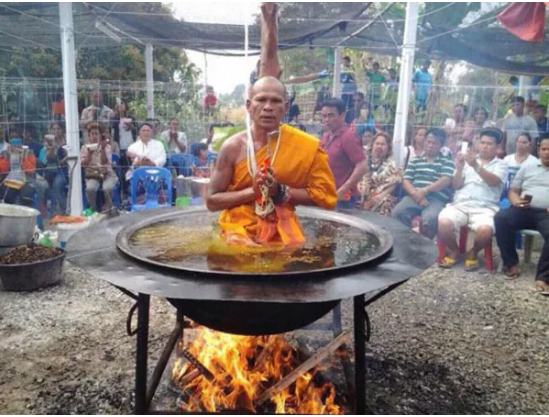 Nhà sư tới từ chùa Nong Bua Lamphu (Thái Lan), ngồi khá thoải mái trong chảo dầu đang được đun nóng. Những người dân xung quanh đã xin nhà sư ban phước bằng cách đưa đồ vật của họ chạm vào ông.