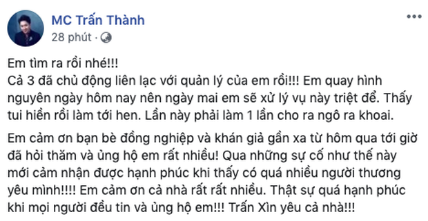 Trước mắt các em cũng đã nhắn tin xin lỗi Trấn Thành rồi. Nên mọi người tạm thời đừng manh động nhé! Ngày mai em sẽ hẹn gặp các em này để xử lý triệt để. Xin cả nhà thương em giữ bình tĩnh nhé! Đừng để những người vô tội bị vạ lây nhé! Em cảm ơn nhiều!", Trấn Thành viết.