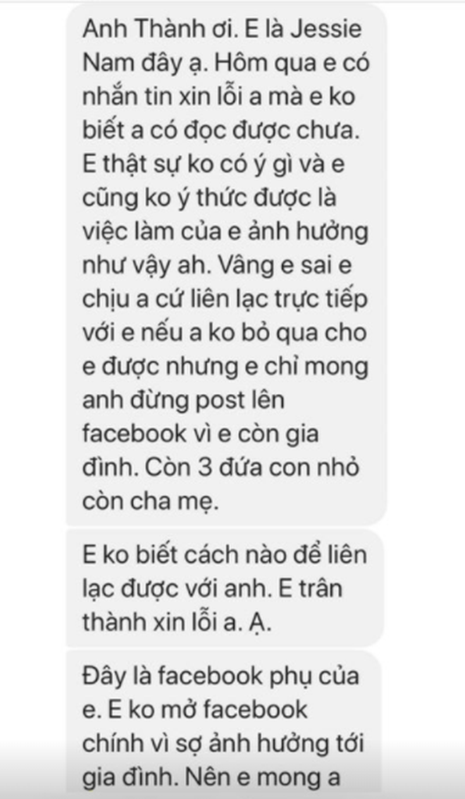 Sau đó, Trấn Thành tiếp tục tung loạt tin nhắn xin lỗi của những kẻ giả mạo và lên tiếng mong netizen không hăm doạ gây áp lực cho gia đình họ.