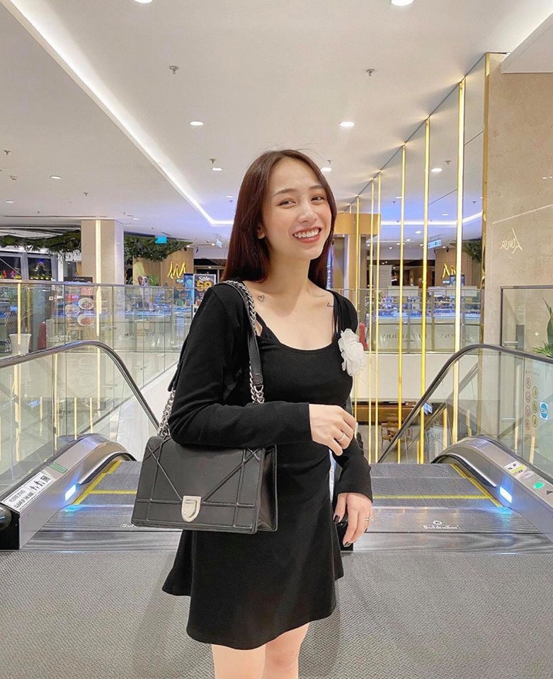 Với những lúc đi chơi hay tiệc tùng, các mẹ sau sinh hoàn toàn có thể ứng dụng mẫu váy chữ A như Minh Anh. Thiết kế tôn lên vòng 1 đầy đặn nhưng lại chạy suông dần xuống dưới, che đi bụng dưới hữu hiệu.