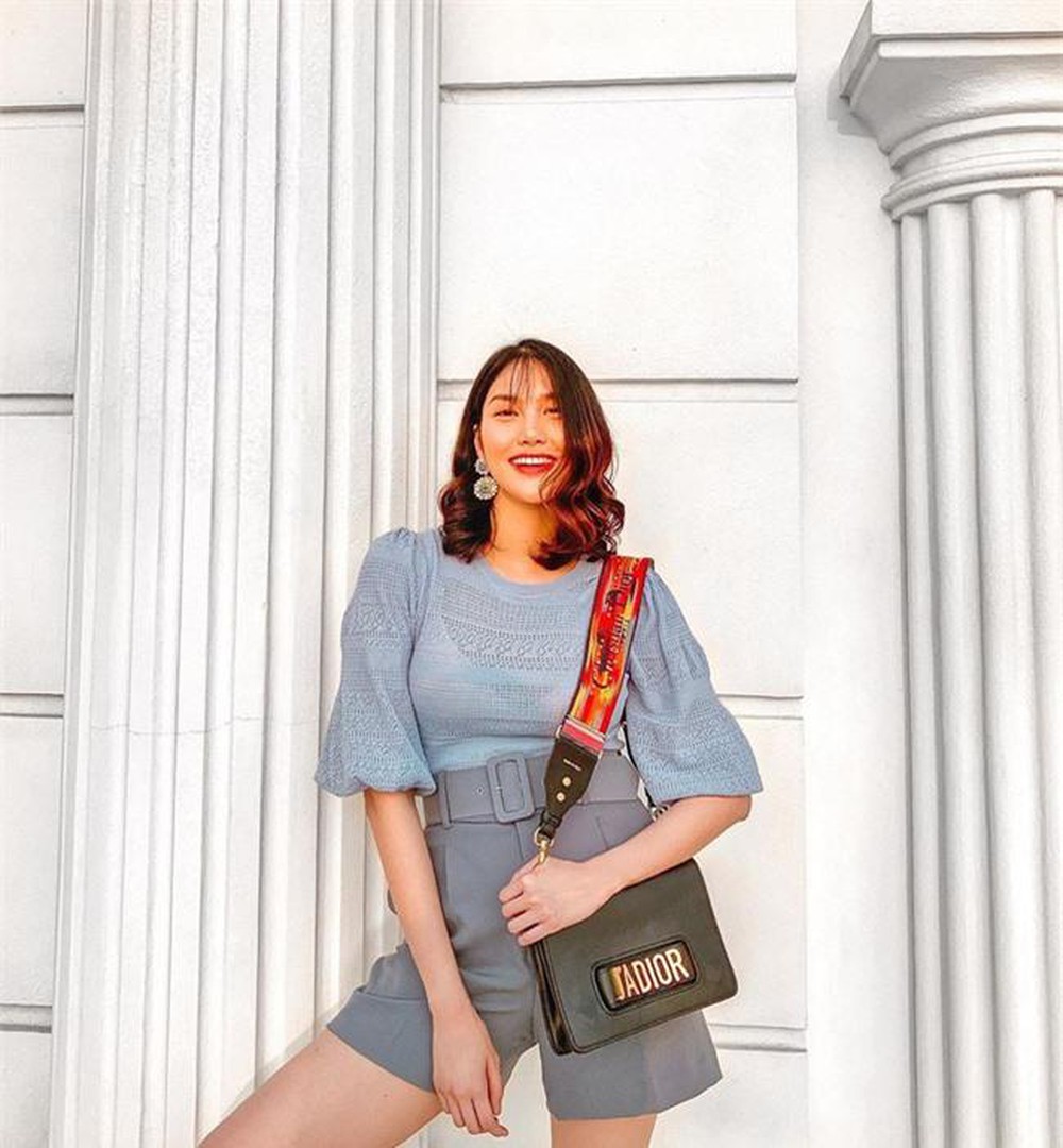 Một gợi ý thú vị về trang phục cho mẹ sau sinh để che khuyết điểm bụng kém thon hay bắp tay to đến từ Lan Khuê. Cô mix quần short vải cạp cao và áo có cổ tay phồng. Chiếc thắt lưng sẽ tạo điểm nhấn cho vòng eo nhỏ hơn.