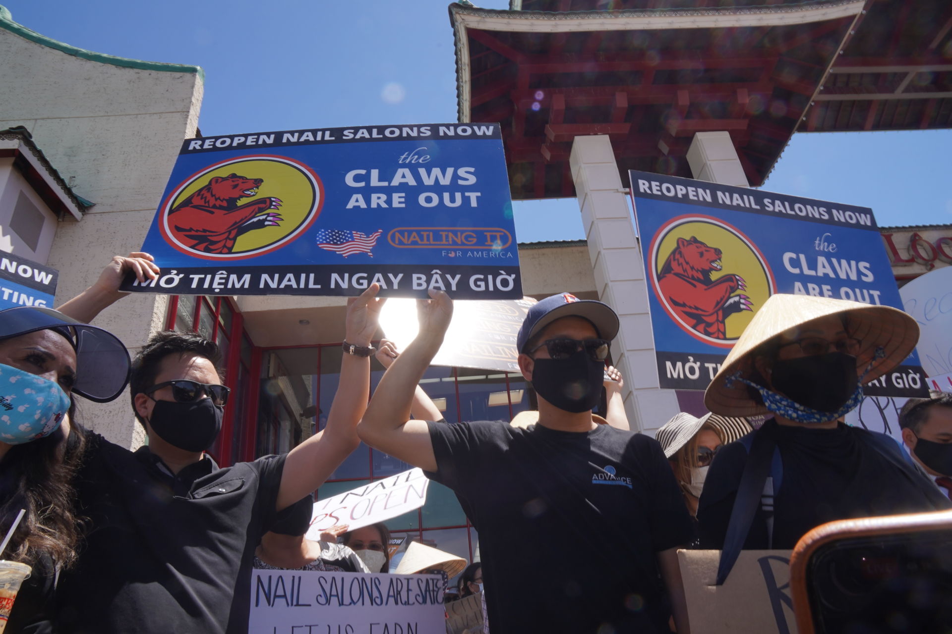 Câu khẩu hiệu “Mở cửa tiệm nail ngay lập tức” nhanh chóng được thay bằng câu “Newsom, open nail salon now – Newsom, mở cửa tiệm nail salon.”