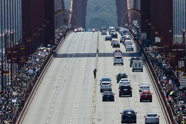 Dòng người biểu tình hai bên cầu Cổng vàng ở San Francisco, California ngày 6/6 (Ảnh: Reuters)