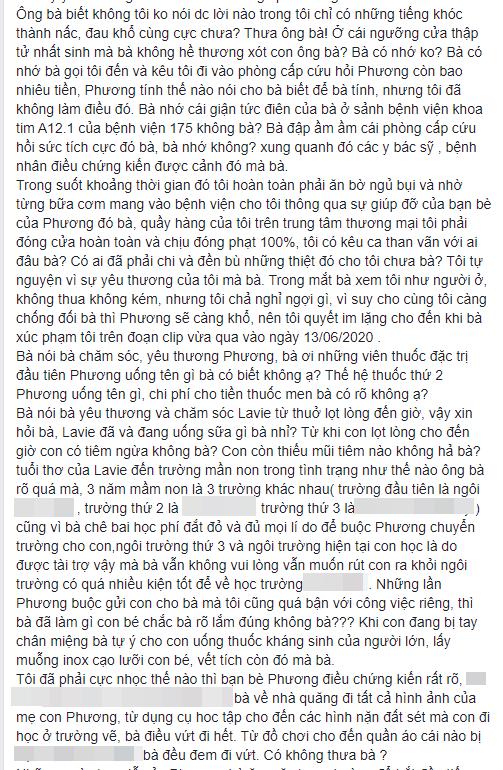 Ở cái ngưỡng cửa thập tử nhất sinh mà bà không hề thương xót con ông bà? Bà có nhớ không? Bà có nhớ bà gọi tôi đến và kêu tôi đi vào phòng cấp cứu hỏi Phương còn bao nhiêu tiền, Phương tính thế nào nói cho bà biết để bà tính, nhưng tôi đã không làm điều đó. Bà nhớ cái giận tức điên của bà ở sảnh bệnh viện khoa tim A12.1 của bệnh viện 175 không bà? Bà đập ầm ầm cái phòng cấp cứu hồi sức tích cực đó bà, bà nhớ không? Xung quanh đó các y bác sỹ, bệnh nhân điều chứng kiến được cảnh đó mà bà', cô tiết lộ.
