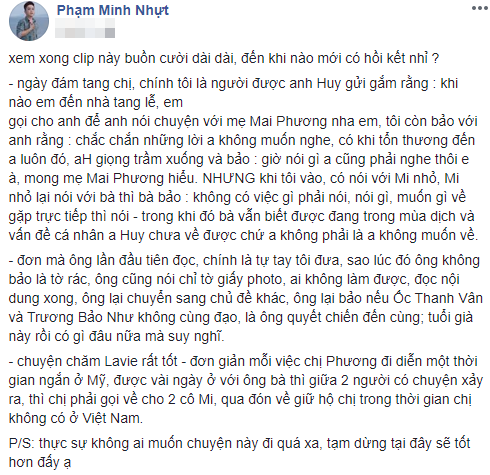 Không chỉ thế, anh cũng nhắn nhủ đến ông bà mong cả hai nên dừng lại sẽ tốt hơn, để Mai Phương yên lòng an nghỉ và Lavie có cuộc sống vui vẻ hơn. (Ảnh: FBNV)