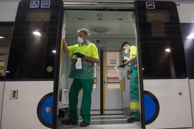 Các nhân viên đã tiến hành khử trùng một đoàn tàu của công ty đường sắt Basque Euskotren ở thành phố Irun thuộc Tây Ban Nha vào tháng 5/ 2020. (Nguồn: The Independent)