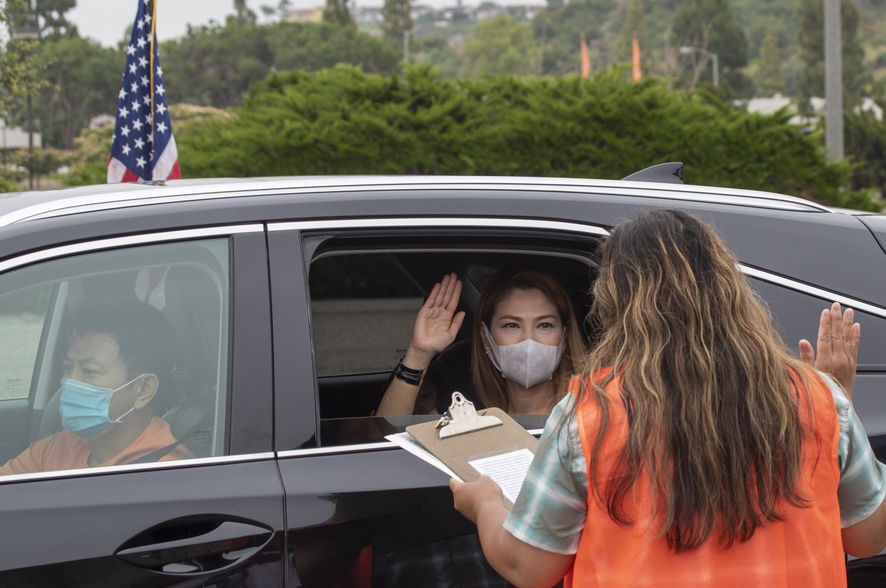 Lần đầu tiên, lễ tuyên thệ thành công dân Mỹ đã diễn ra bằng hình thức “drive-thru” hôm Thứ Tư, 29 Tháng Bảy, 2020, tại Santa Ana, nơi có nhiều người Việt sinh sống.