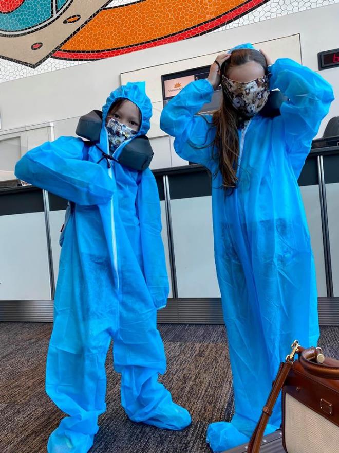 Hình ảnh các con của Hồng Nhung khi lên máy bay về Việt Nam. Bé Tôm gọi bộ trang phục bảo hộ là "bộ đồ phi hành gia".