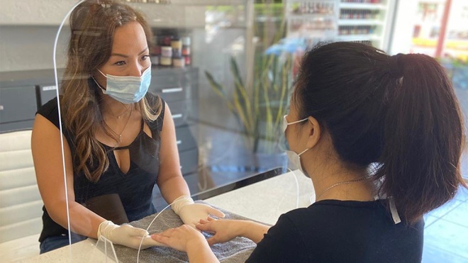 Nhân viên tiệm Mod Nail Lounge ở Dallas, Texas đeo khẩu trang, găng tay, phục vụ khách hàng qua kính chắn. Ảnh: Tiệm Mod Nail Lounge.