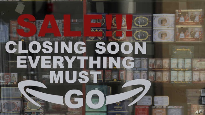 Một cửa tiệm thông báo xả hàng ở London sau lệnh phong tỏa, ngày 15/4. Ảnh: AP.