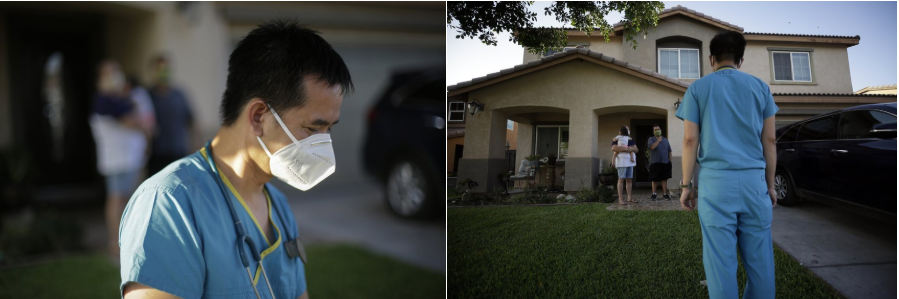 Bác sĩ Tien Vo tới khám một gia đình nhiễm Covid-19, phải cách ly tại nhà, ngày 23/7. Ảnh: AP.