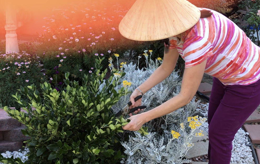 Chị Tuyến chỉ thích cắt tỉa, dọn dẹp mảnh vườn. (Hình: Đoan Trang/Người Việt)