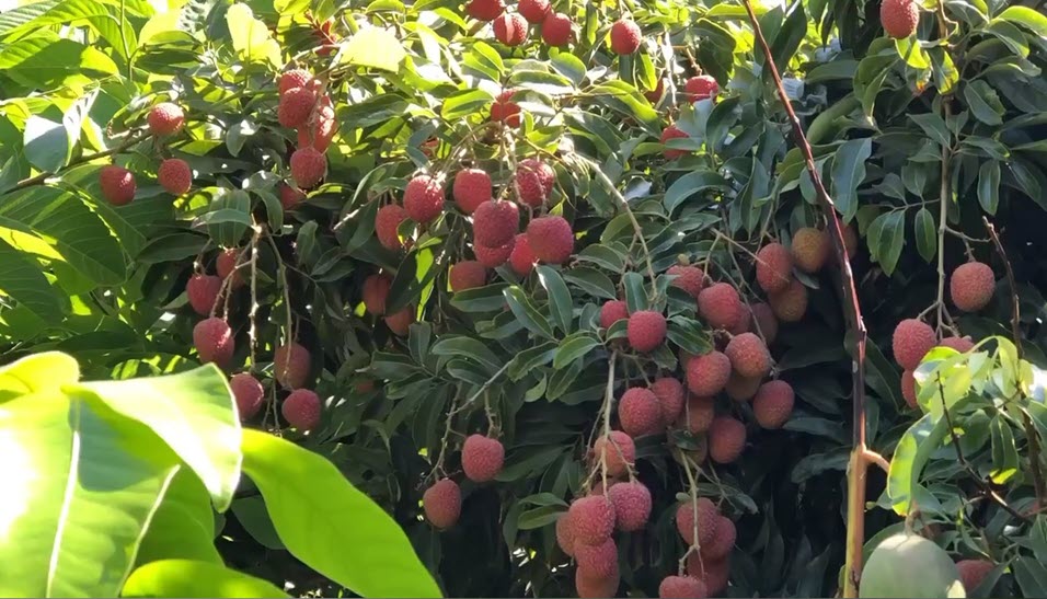 Trái kín mít trên cây vải ở vườn nhà anh Long. (Hình: Đoan Trang/Người Việt)