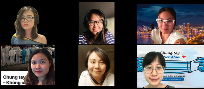 Nhóm 5 cô gái Việt ở Mỹ và một thành viên tại Việt Nam trong cuộc họp trực tuyến hàng ngày về chiến dịch. Từ trái sang, từ trên xuống: Trương Phan Ngọc My, Nguyễn Hà, Bùi Ngọc Thi, Triệu Thuỳ Lan, Đoàn Thị Minh Phượng và Ngô Ngọc Linh. Ảnh: Nhân vật cung cấp.