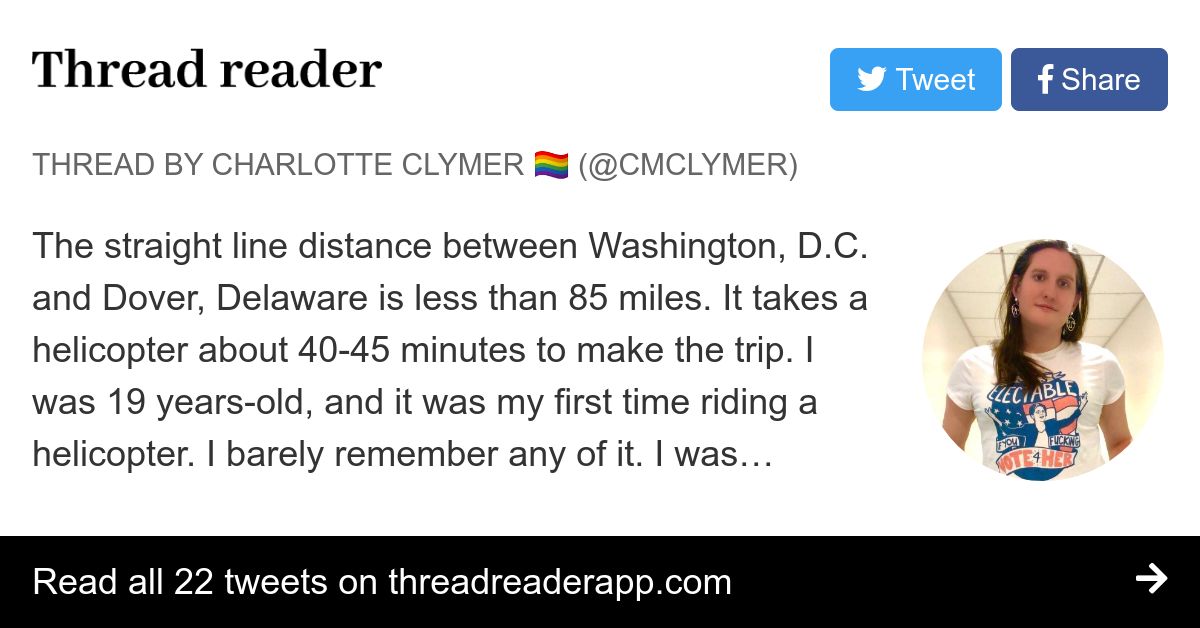"The straight line distance between Washington, D.C. and Dover, Delaware is less than 85 miles. It takes a helicopter about 40-45 minutes to make the trip. I was 19 years-old, and it was my first time riding a helicopter. I barely remember any of it. I was distracted.