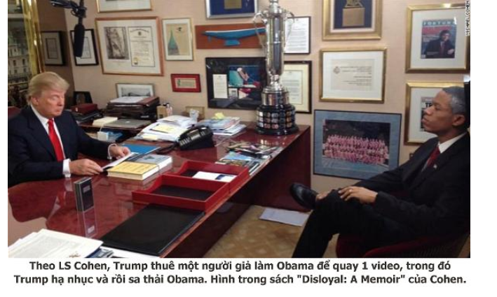 Nhân vật giả làm Obama được kể trong sách là "Faux-Bama" nhưng không ghi tên thật người được thuê này, và trong sách Cohen đã in tấm hình đó trong khi trên bàn của Trump trong video có 2 cuốn sách, một cuốn in chữ lớn tên của Obama. Hai ban biên tập CNN và Washington Post đã làm tin theo ấn bản sách này phổ biến trước cho giới truyền thông.