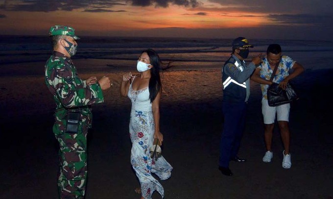 Các sĩ quan nhắc nhở du khách đeo khẩu trang tại Badung, tỉnh Bali, Indonesia, hôm 3/9. Ảnh: Reuters.