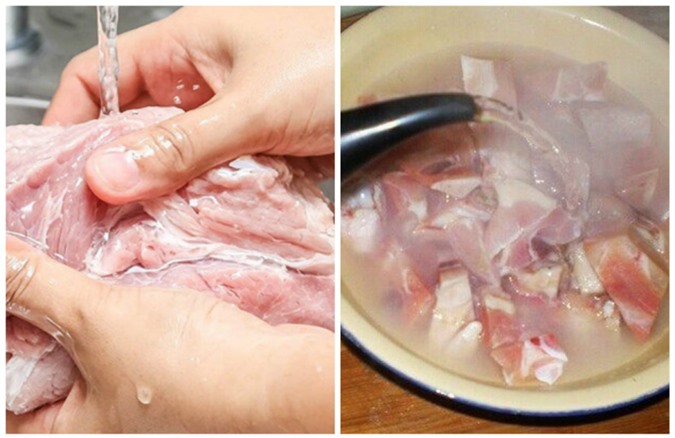 Rửa thịt bằng nước vo gạo: Bạn hãy chuẩn bị một chậu nước vô gạo rồi thả thịt vào đó để rửa và ngâm trong nước vo gạo khoảng 5 phút để tinh bột trong nước vo gạo hút hết chất bẩn có trên bề mặt thịt.