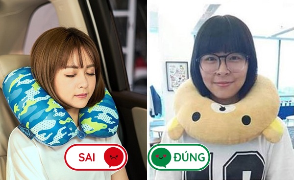 Gối chữ U phải quay ra phía trước mới đúng, hai phần đuôi gối đặt ra sau gáy, phần phần vòng tròn nằm tiếp xúc với cổ. Khi bạn sử dụng cách này, gối không bị tụt và vẫn ôm khít vòng cổ, cảm giác thoải mái.