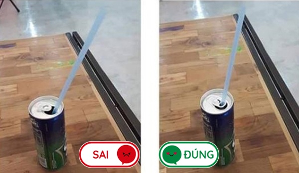 Nhiều người cắm ngay ống hút sau khi bật nắp khiến chiếc vòi dễ bị rơi, bắn tung tóe ra ngoài. Cách cắm vòi đúng là: Bạn bật nắp sau đó xoay ngược sao cho lỗ nhỏ trên nắp song song với miệng lon rồi cắm ống hút vào lỗ ở nắp.