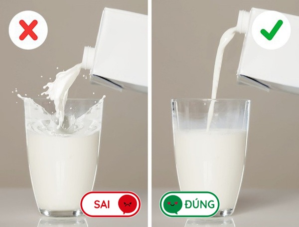 Không ít người làm đổ tung tóe sữa/nước trái cây ra bàn bởi ghé miệng hộ gần miệng cốc để đổ. Cách rót đúng là bạn hãy quay phần miệng của hộp lên trên và đổ vào cốc. Với cách này, bạn sẽ rót thoải mái mà không sợ bắn ra ngoài.