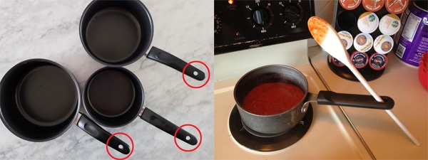 90% mọi người nghĩ rằng lỗ nhỏ ở trên cán chảo để treo vào móc dễ hơn. Ít ai biết nó còn có công dụng nữa là nơi cố định chiếc muôi, thìa, đũa.... khi bạn đang nấu bếp mà muốn nghỉ tay để xử lý một việc khác.