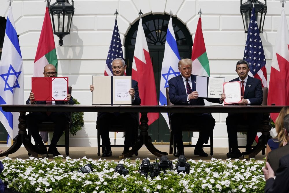 Tổng thống Mỹ Donald Trump với Bộ trưởng Ngoại giao Bahrain Khalid bin Ahmed Al Khalifa, Thủ tướng Israel Benjamin Netanyahu và Bộ trưởng Ngoại giao Các Tiểu vương quốc Ả Rập Thống nhất Abdullah bin Zayed al-Nahyan, trong lễ kư Hiệp định Abraham tại Băi cỏ phía Nam của Nhà Trắng, Thứ Ba, Tháng 9 15, 2020, tại Washington. (Ảnh AP / Alex Brandon)