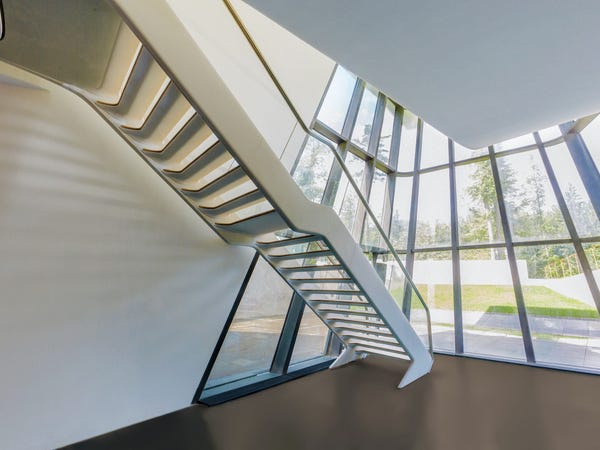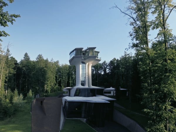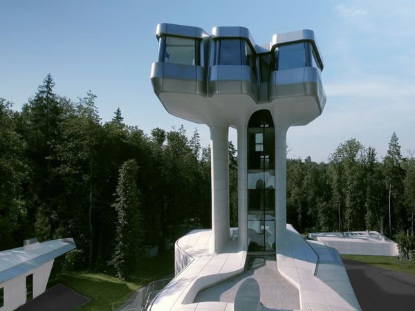 Biệt thự "Capital Hill Residence" nằm giữa một khu rừng tại Nga, có biệt danh “Ngôi nhà tàu vũ trụ”. Đây là tài sản của tỷ phú bất động sản Nga Vladislav Doronin. Theo Business Insider, đây cũng là biệt thự tư nhân duy nhất được xây dựng theo thiết kế của kiến trúc sư Zaha Hadid. Ảnh: OKO Group.