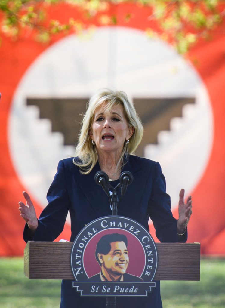 Lá cờ của liên minh công nông là bối cảnh cho bài phát biểu của Jill Biden