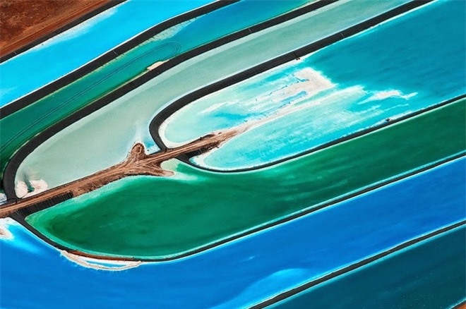 Hình ảnh bảy sắc cầu vồng nổi bật trên vùng núi đá đỏ hồ nước nhân tạo của công ty sản xuất kali lớn nhất Mỹ, Intrepid Potash, nằm dọc theo con sông Colorado, cách Moab, Utah 30 km về phía tây.