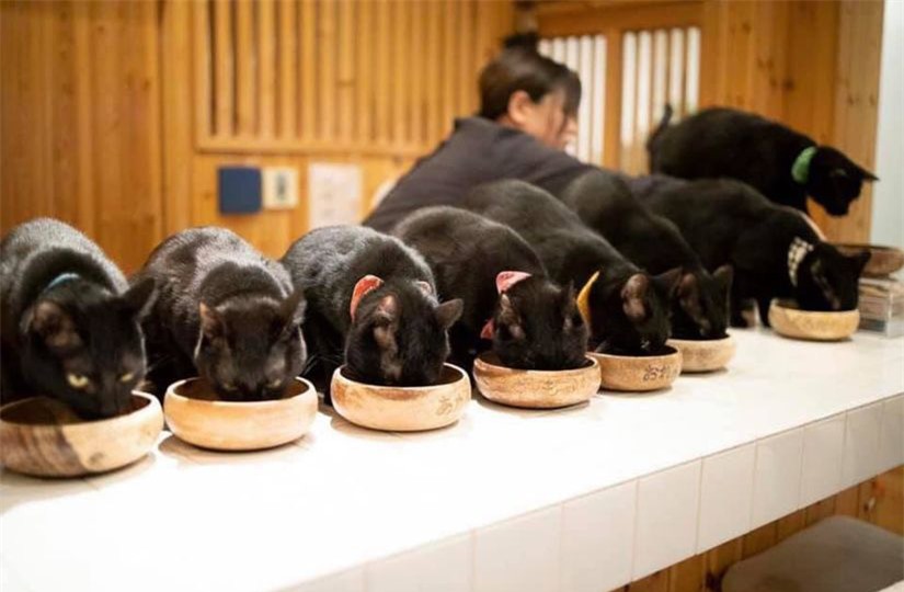 Luôn có ít nhất 10 con mèo đen trong quán cà phê, mỗi con đeo một chiếc vòng có màu sắc khác nhau quanh cổ để giúp du khách có thể phân biệt chúng. Thậm chí còn có một "menu mèo" liệt kê tất cả các con mèo khác nhau và màu vòng cổ của chúng.