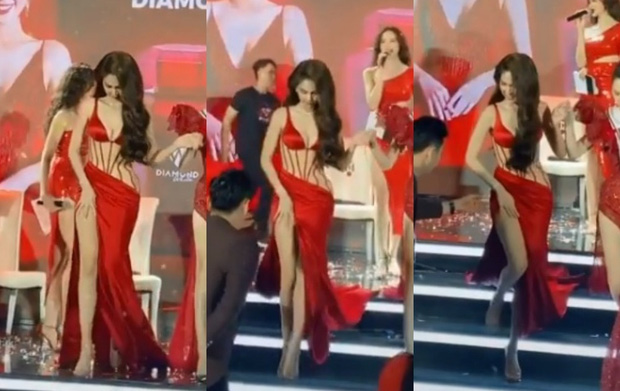 Tuy nhiên, nhìn Ngọc Trinh diện đầm gợi cảm là thế chứ thực ra cô cũng chật vật ra phết, liên tục phải lấy tay che chắn để tránh hớ hênh.