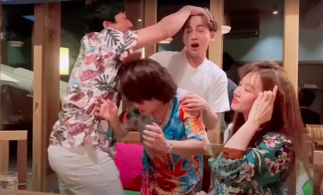 Đến cuối clip, dân tình mới hoàn toàn chắc chắn rằng toàn bộ tình huống trên chỉ là một trò đùa của nhóm bạn. Trấn Thành tặng cho Hari Won một nụ hôn ngọt ngào để an ủi vì hành động túm tóc lúc trước.
