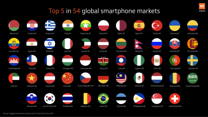 Xiaomi hiện đứng trong top 5 nhà sản xuất smartphone lớn nhất tại 54 thị trường trên toàn cầu. Nguồn: Canalys.