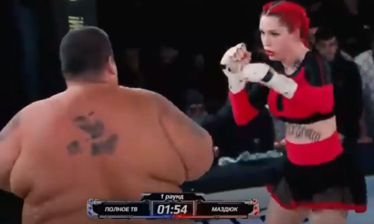 Nữ võ sĩ Darina Madzyuk đã liên tục tung ra những cú đấm uy lực khiến 'gã khổng lồ' Chistyakov choáng váng. Không thể tin một cô gái nhỏ bé lại khỏe như vậy. Ai cũng không khỏi ngạc nhiên.