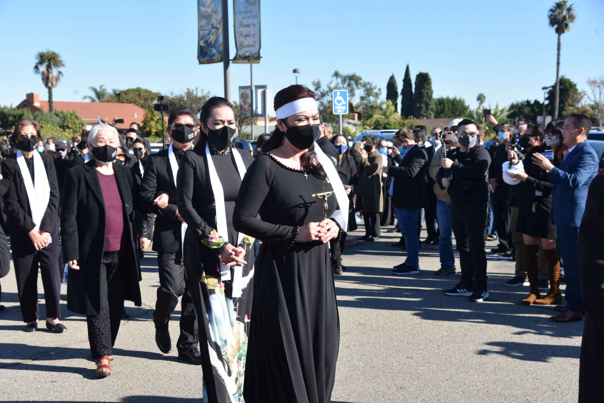 Linh cữu danh hài Chí Tài được Giám Mục Nguyễn Thái Thành, giám mục phụ tá Giáo Phận Orange, đón vào nhà thờ. (Hình: Văn Lan/Người Việt)