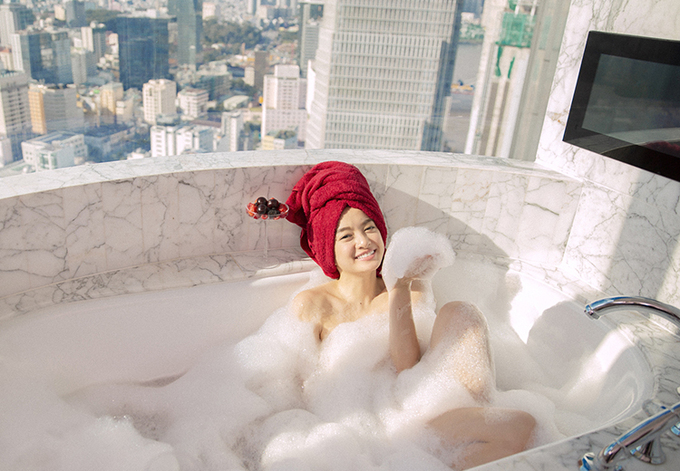 Kaity đóng cảnh tắm bồn ở một penthouse ở trung tâm TP HCM trong "Gái già lắm chiêu V - Những cuộc đời vương giả".